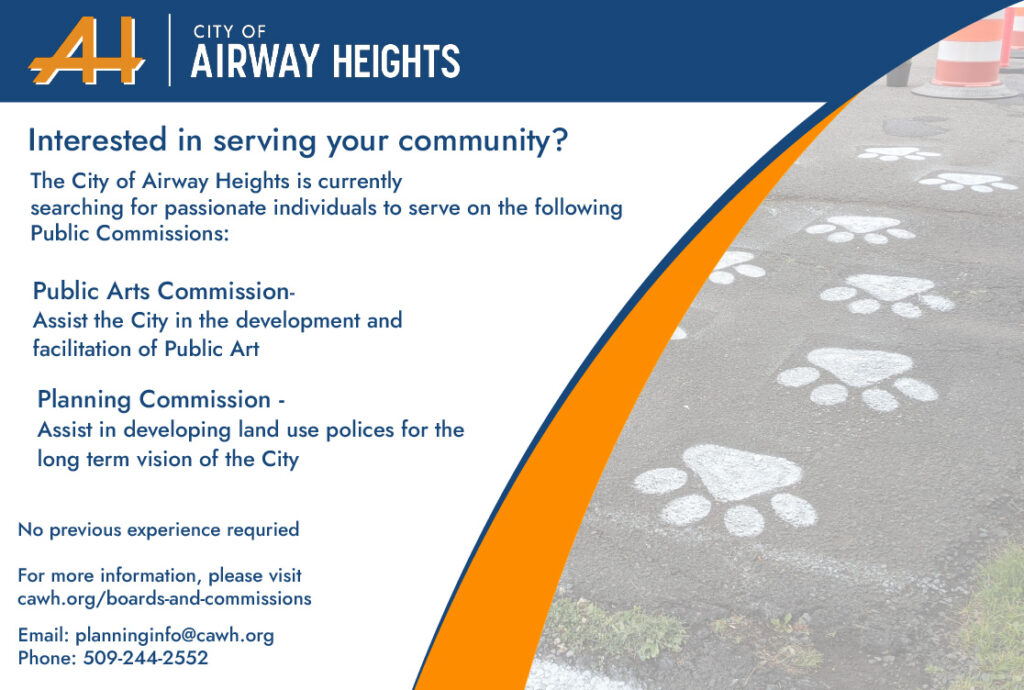 The City of Airway Heights is searching to fill one vacancy on the Planning Commission and one vacancy on the Arts Commission.